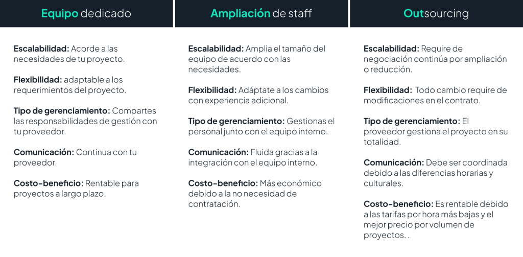Comparación entre equipo dedicado, ampliación de staff y outsourcing: toma decisiones informadas para el éxito de tu negocio